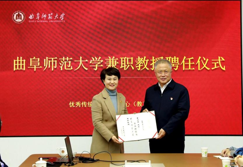 党总支书记茌淑君向董洪波颁发聘书。优秀传统文化教育中心(教育培训中心)主任沈秀清在致辞中,对董洪波受聘为兼职教授表示祝贺,向曲阜市政协长期以来给予万博体育