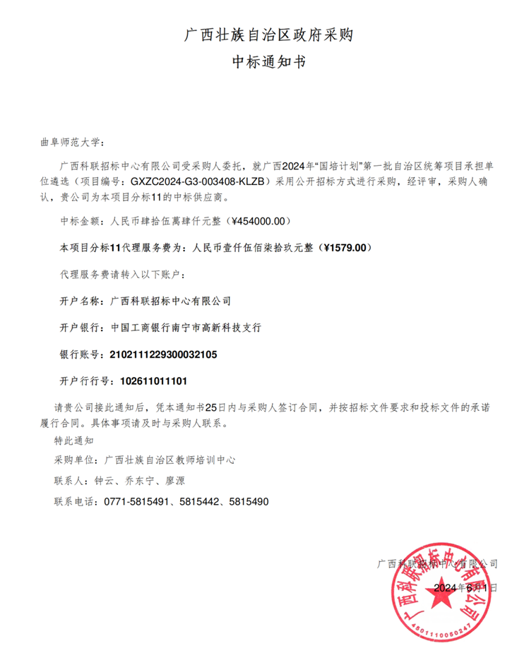 2024年6月1日,中国政府采购网及中国政府购买服务信息平台正式公布了《广西科联招标中心有限公司关于广西2024年“国培计划”第一批自治区统筹项目承担单位遴选(GXZC2024-G3-003408-KLZB)中标结果公告》,万博体育
