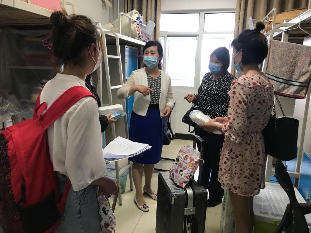 南门口体温检测点到学生宿舍报到处,在测体温、行李消毒、身份核验等全过程,同学们深切感受到了老师们的全程陪伴,悉心关爱。茌书记亲切与返校学生交谈,详细询问返校路上情况、居家学习情况和返校后的学习安排情况;叮嘱同学们严格遵守防疫期间校园相关管理规定,增强个人安全防护意识,勉励同学们克服疫情带来的影响,尽快适应返校生活,注意个人卫生,做好学习规划,让学习生活早日步入正轨。何爱霞院长叮嘱大家返校后学习生活的注意事项,孙长远老师帮助搬行李、发放口罩、酒精消毒液、体温计、防疫知识手册等防疫物品,使返校学子第一时间感受到了来自万博体育