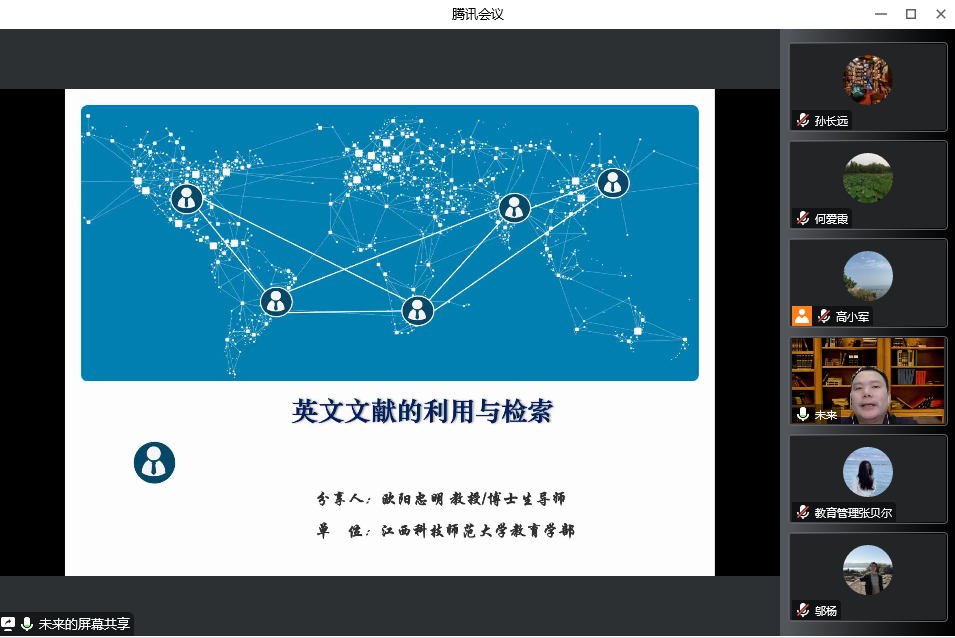 欧阳教授从“英文文献的利用”和“英文文献的检索”两大主题展开。在英文文献的利用方面,以联合国教科文组织的《共同构想我们的未来:一个新的教育社会契约》报告为例,详细介绍了如何将报告转化为研究主题,悉心传授英文文献的使用经验。通过“我们能获得什么?我们应该怎样去做?”两个问题的反问,启发同学们不应仅仅局限于报告来进行研究,而是要旁征博引,用其它文献论证自己观点,加深理论深度。在英文文献的检索方面,他通过实操性的检索,分享了Sci-Hub、Google、ResearchGate、unesco数字图书馆、Cedefop等数据库的检索经验,并鼓励同学们多阅读英文文献,多读高质量、前瞻性、具有启发性的文章。