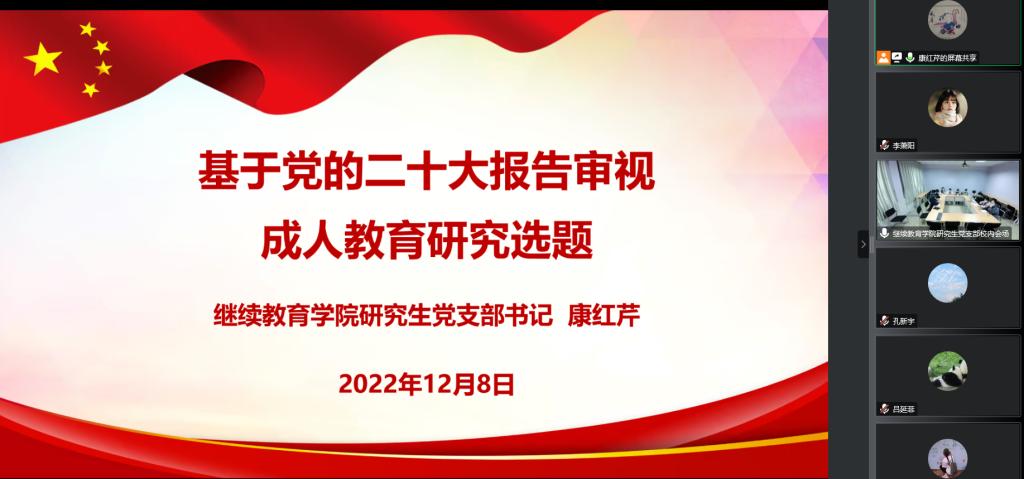 研究生党支部书记康红芹以“基于党的二十大报告审视成人教育研究选题”为题,为万博体育