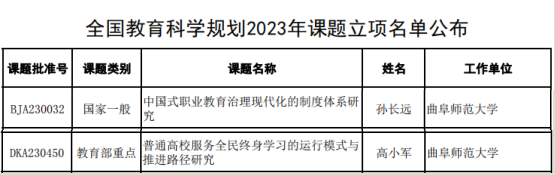 孙长远副教授主持的课题《中国式职业教育治理现代化的制度体系研究》获批全国教育科学规划2023年度国家一般课题(课题编号:BJA230032);高小军博士主持的课题《普通高校服务全民终身学习的运行模式与推进路径研究》获批全国教育科学规划2023年度教育部重点课题(课题编号:DKA230450)。