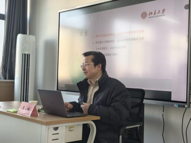 特邀北京大学吴峰教授来院进行学术交流,并作题为《终身教育的力量》的专题报告。报告会由研究院院长何爱霞教授主持,全体师生参会学习。